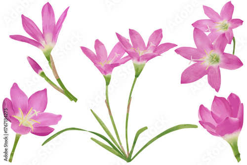 Pink rain lily flower illustration. Watercolor style pink lily collection isolated on white background.