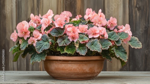 Pink Rex Begonia flowers in full bloom, beautifully arranged in a rustic terracotta planter against a natural wood backdrop.