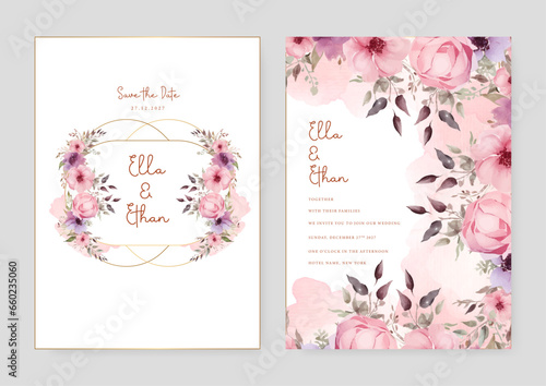 Pink rose artistic wedding invitation card template set with flower decorations