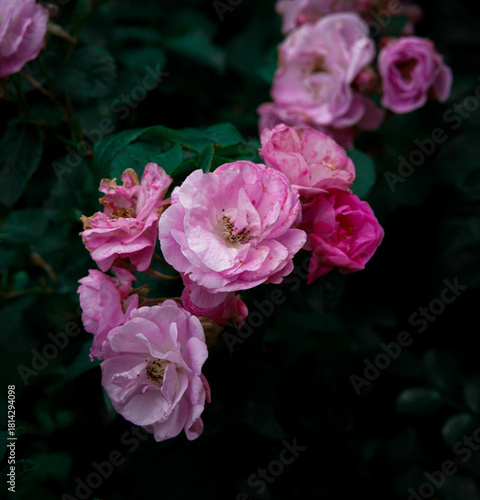 Pink Rose Bush in Bloom with Fresh Petals and Buds