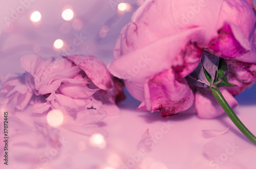 Pink rose close up, macro, petal and wilting flower, bokeh