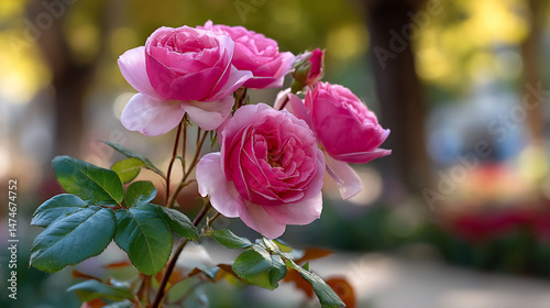 Pink roses bloom, petals open, leaves are glossy and lush, background is blurred
