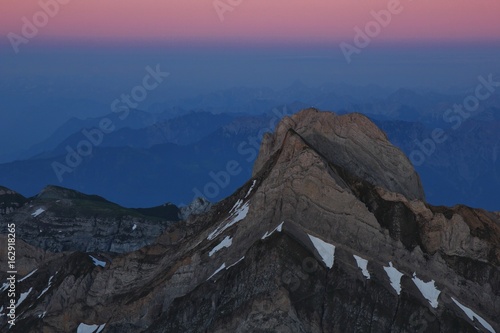 Pink sky over Mount Altmann, Switzerland. View from Mount Santis. Summer evening in the Swiss Alps.