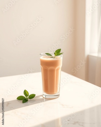 Pink smoothie in clear glass on white marble table with pastel background, clean and modern look