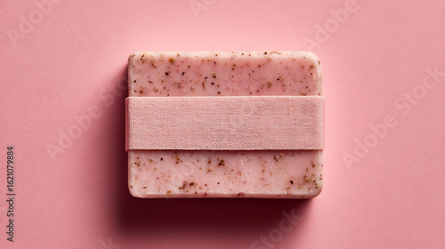 Pink soap bar with botanical inclusions and textured band image