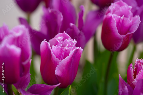 Pink spring flowers tulips. Spring background for Easter or Valentines Day. Beautiful bouquet of tulips in spring with blurred background. Bright purple color of blossom tulips. Violet Spring flower.
