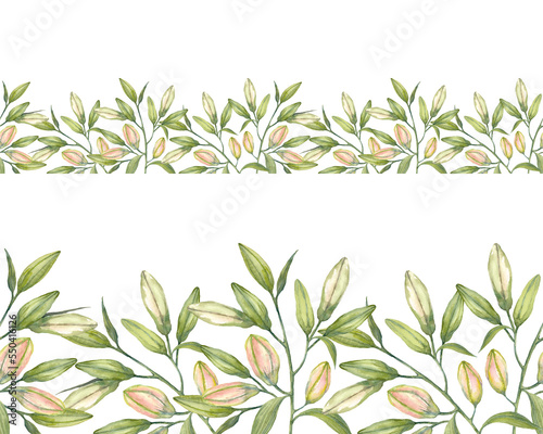 Pink Stargazer Lilies. Lily buds. Watercolor flowers. Seamless border. Hand-drawn art for greeting cards, invitations and interior decoration. Artistic illustration