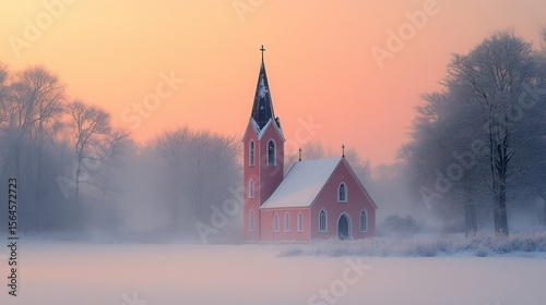 pink steeple of small church surrounded by fresh white snow in quiet winter countryside, soft natural lighting