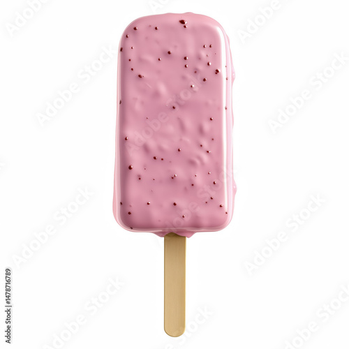 Pink strawberry coated ice cream bar on wooden stick, sweet frozen dessert with crunchy texture, realistic summer treat, isolated on transparent background.