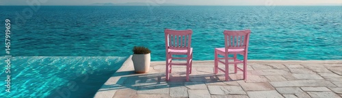 Pink summer vacation beside pool with nobody and chairs concept. Serene ocean view with pink chairs by the tranquil pool.