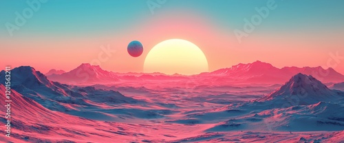 Pink sunset over alien mountains and moon.