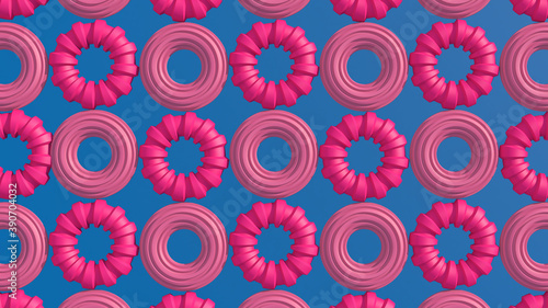 Pink textured rings. Blue background. Abstract illustration, 3d render.