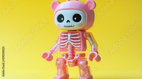 Pink toy skeleton with a bear head on a yellow background.
