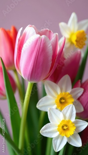 Pink tulip and white daffodil mix in a colorful bouquet, flower arrangement, spring flowers, white daffodils