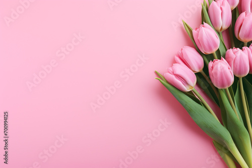 Pink tulip spring flowers on side of pastel pink background with copy space