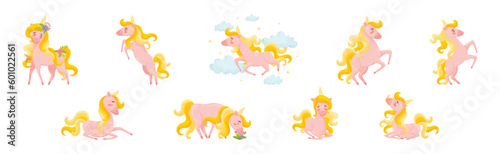 Pink Unicorn with Slender Legs and Golden Mane Vector Set