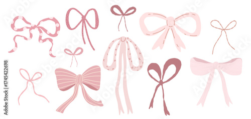Pink vector bows set. Collection of decorative ribbons and gift bows in soft pastel tones. Perfect for holiday cards, packaging design, baby shower invitations, scrapbooking, and festive decorations