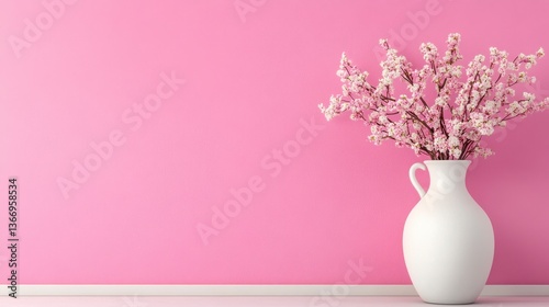 Pink Wall Minimalist Interior with White Vase and Cherry Blossoms