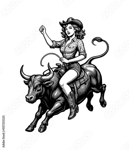 Pinup Cowgirl Riding Bull with Lasso in Air in Detailed Black and White Vintage Art