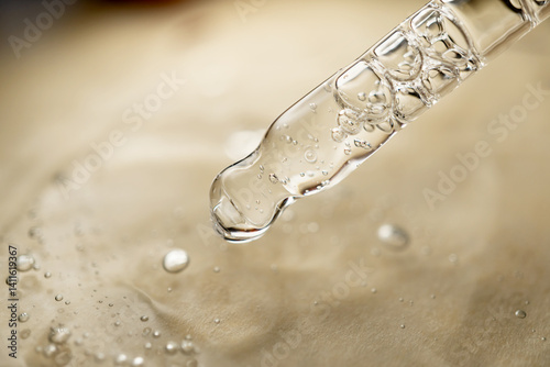 Pipette with essential oil on blurred background