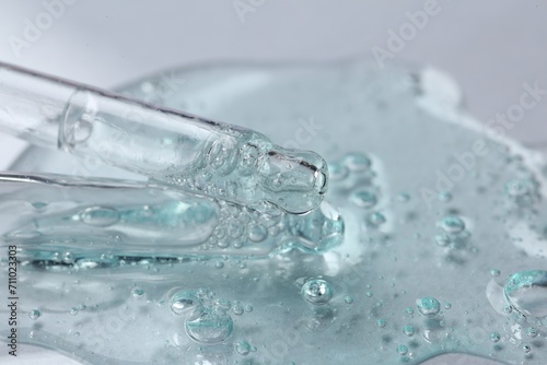 Pipettes with cosmetic serum on white background, closeup. Space for text
