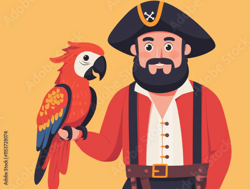 Pirate cartoon kids story. Cartoon pirate with a parrot against a yellow background.