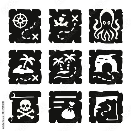 Pirate Map Icons. Solid style icons of pirate treasure maps: torn paper, compass route, shipwreck marker, kraken illustration,