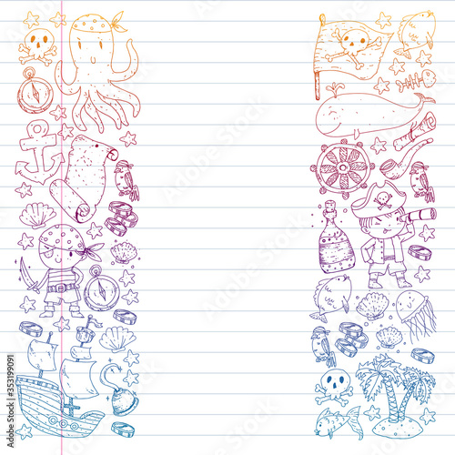 Pirate party. Illustrations for little children. Kids birthday celebration with treasure island, octopus, pirates