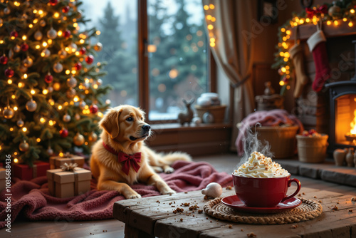 Pisesek w czerwonej obroży, w tle świąteczne dekoracje: choinka, kominek, girlandy. Przytulna atmosfera Bożego Narodzenia w luksusowym wnętrzu.