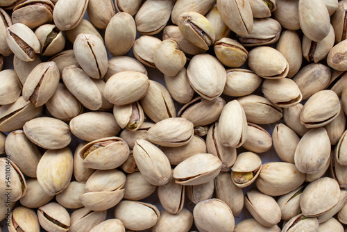 Pistachio nuts background. Close up of pistachio nuts. Top view