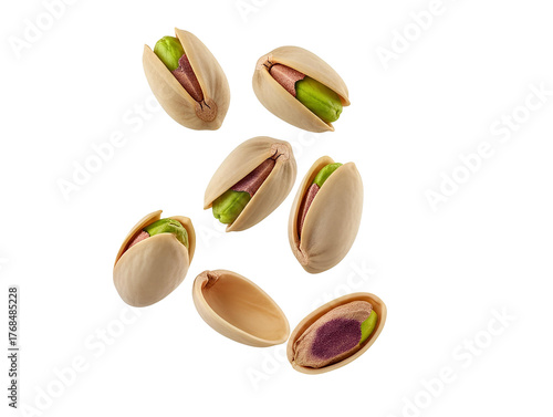 pistachio nuts PNG. Pistachios falling down isolated. Green pistachio seeds top view flat lay suspended in air isolated. Organic and healthy pistachio PNG
