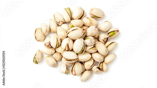 Pistachio nuts scattered on a white background, highlighting their natural colors and textures for culinary use and health benefits
