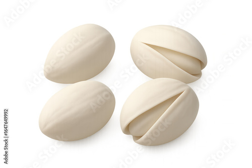 Pistachio nuts with cracked shells exposing green kernels, suspended against transparent background, showcasing natural texture