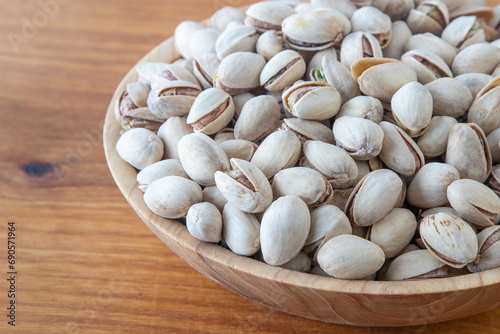 Pistachios in a wooden bowl. Wooden background. Healthy food