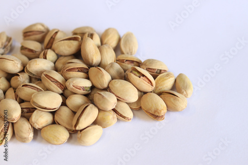 Pistachios on a white background. A handful of dry salted pistachios on a light background, selective focus. Pistachio with shell. Close-up