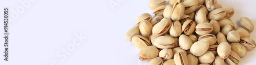 Pistachios on a white background. A handful of dry salted pistachios on a light background, selective focus. Pistachio with shell. Close-up