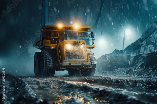 Pit mine industry, big yellow mining truck for coal anthracite in rainy mine background. Neural network ai generated
