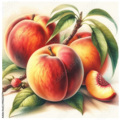 Pitch, apricot plum,hand drawin watercolor illustration, fruit, food, orange, healthy, fresh, isolated, citrus, organic, red, nature, sweet, fruits