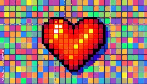 pixel art a pixelated heart made of 8 bit squares, with a retro gaming aesthetic, floating against a vibrant, colorful grid background.
