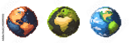 Pixel Art Earth Globe Set Orange Green Blue Icon Illustration
