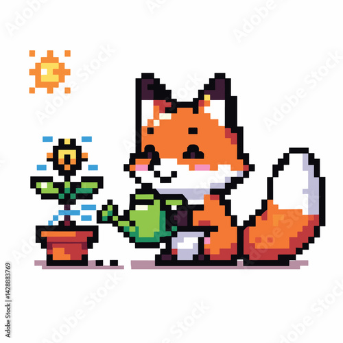 Pixel Art Fox Gardening Cute Fox Watering Flower with Sun