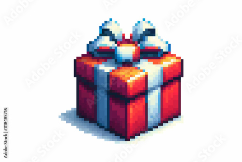 Pixel art gift box with red wrapping white ribbon and bow creating a festive and visually appealing design.