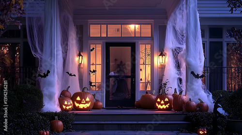 Pixel Art Halloween House Decorated With Glowing Jack O Lanterns Cobwebs and Bats on Porch at Night