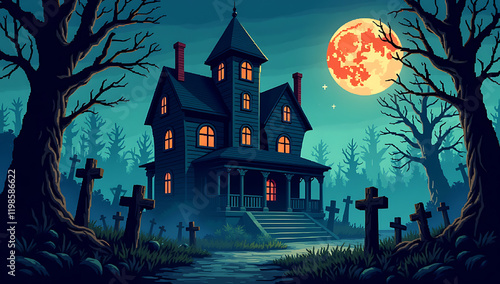 Pixel art haunted mansion with crooked towers, flickering windows, and a spooky graveyard surrounded by fog, set under a full moon in a dark forest, perfect for a retro-style horror game