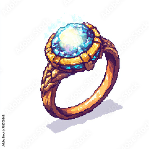 Pixel Art of a Magical Ring with Glowing Gem, Isolated on a White Background