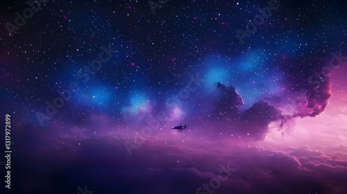 Pixel Art Spaceship Soaring Through a Vibrant Purple and Blue Nebula with Twinkling Stars in the Vast Expanse of Outer Space