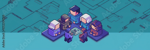 Pixel art style characters in blue and brown colors gathering around a table for a meeting representing teamwork and collaboration