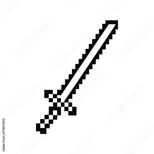 Pixel Art Sword Isolated on White Background, Retro Gaming Style, Black and White