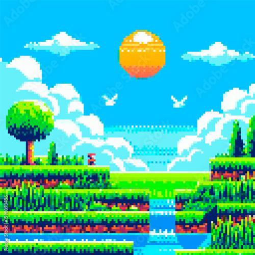 Pixel art vector illustration in retro 8-bit style. The theme is nature landscape with bright blue sky, orange sun, green trees, grass, river, and blocky geometric shapes. Energetic and nostalgic.
