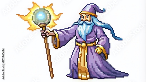 Pixel Art Wizard with Magic Staff and Glowing Orb Isolated on White Background for Fantasy, Gaming, and Creative Projects